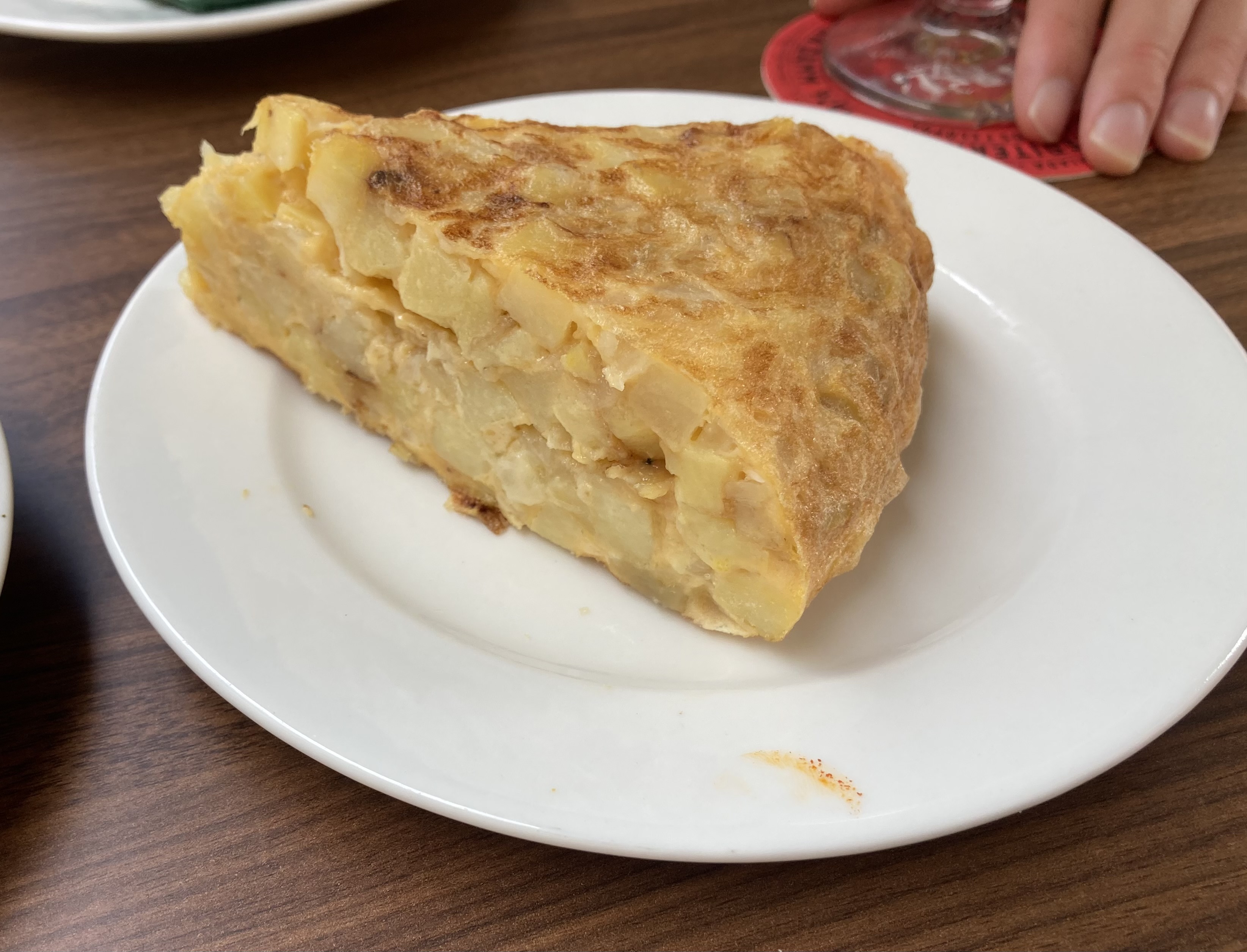 - 대표적인 스페인 감자 오믈렛. 얇게 썬 감자와 양파를 올리브 오일에 천천히 익힌 뒤 계란과 함께 팬에 구워 만든 요리. 스페인 사람들이 아침, 점심, 심지어 타파스로도 즐겨 먹는 요리. 따뜻하게도, 차갑게도 먹는다.