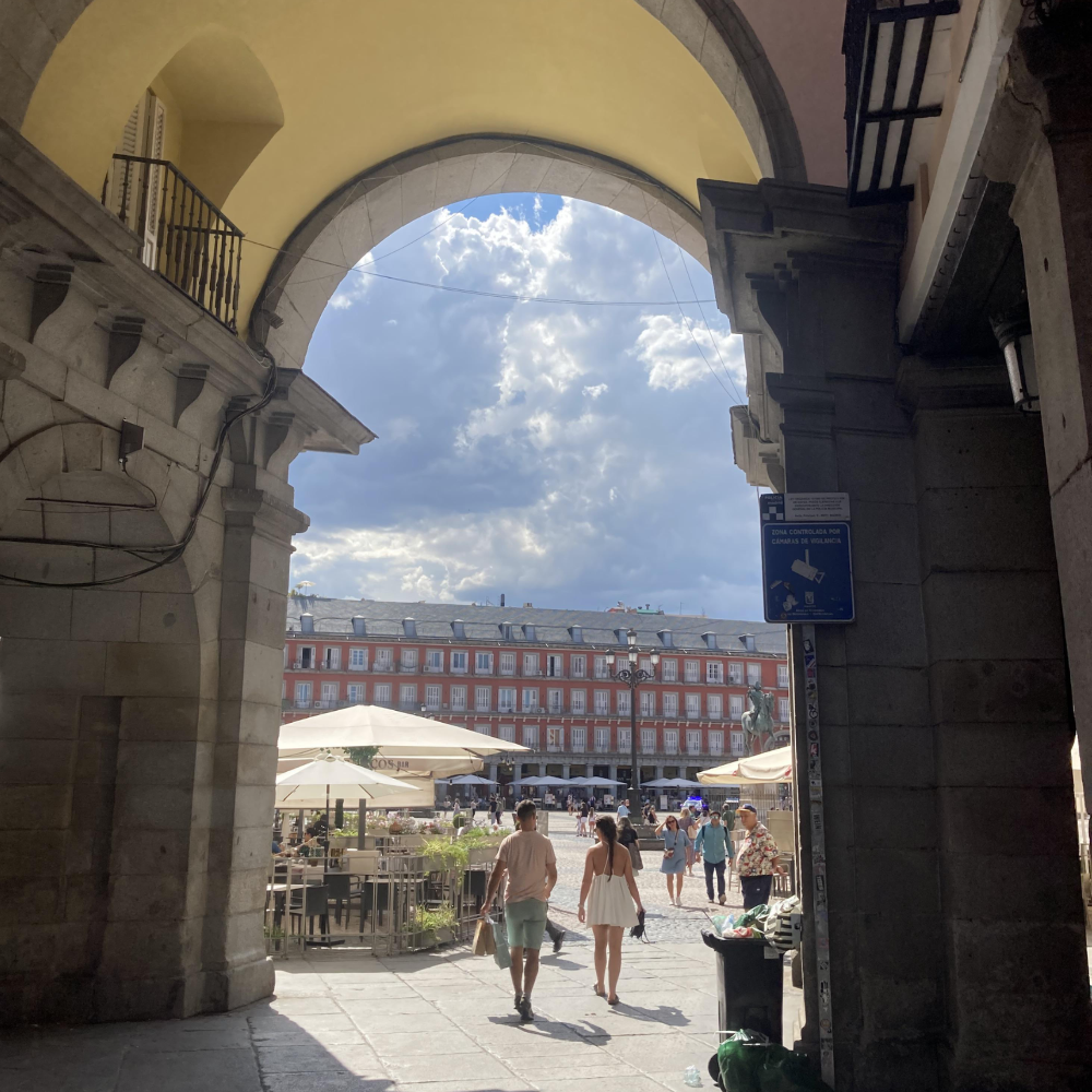 스퀘어 모양의 마요르 광장은 광장 사방으로 건물이 쭉 둘러져 있다. 광장 내 빌딩은 팥죽색(?) 같은 매력적인 붉은색의 컬러인데, 이 컬러는 시민들의 투표로 정한 것이라고 한다. 유럽의 광장 중 큰 규모를 자랑하고 있는 마요르 광장에 꼭 방문해 보기 바란다. 건물로 둘러싸여 있는 광장 곳곳에 밖으로 통하는 아치형의 문이 있는데, 문 밖에서 바라보는 마요르 광장의 모습도 매우 매력적이다.